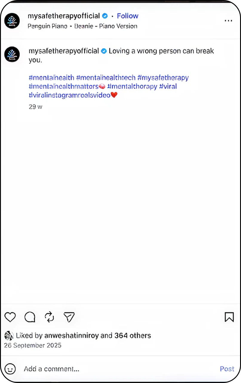 - A visual identity on the feed that is instantly recognisable as MySafeTherapy, not because of a logo, but because of the whole composition.