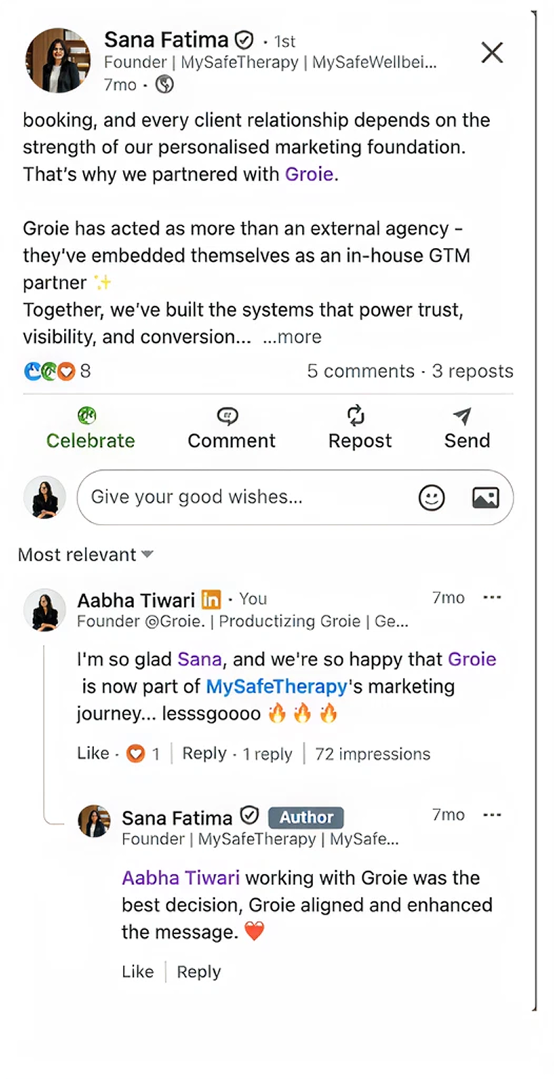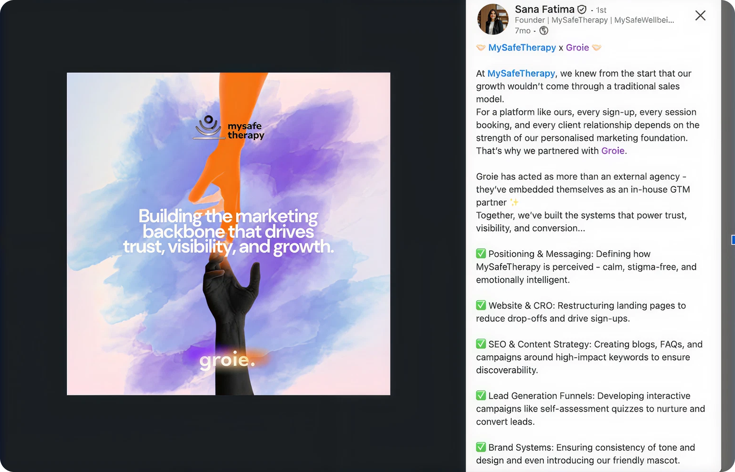 We run MySafeTherapy's social media and reels production in-house. Creative direction, scripting, editing, captioning, and scheduling all sit under one roof at Groie.